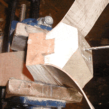 The logical thing to do would be to use zinc platted sheet metal screws. For sure, if Richard Meares could have walked down to the hardware store and bought a handful of these for next to nothing he would have, and he would have been pleased as punch to use them in his viols. He couldn't. He could go to the blacksmith and buy nails. I haven't got a local blacksmith shop, I do have an Ace hardware. Nice screws for $.06 each. So what do I do? Forge my own nails. Go figure. I drill pilot holes first. Don't want the nails to split the block. One nail would suffice, but what the heck, nails are cheap, as long as I'm making one I may as well do two. |