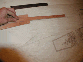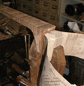 The heal of the neck and the block are trimmed. The wood here is end grain, and will soak up glue like a sponge. It should be well sized with glue-- hide glue, of course. Paint some thin glue on, let it soak in, add more, keep it up until the wood stops drinking the stuff up. I scrape any excess off before it dries hard- I want the surface sealed, I don't want a build up on the surface. The wet glue swells the wood. If you glue the back on while the block is wet it will shrink, and that's not good for the joint. Not good at all. Let it dry. Do the other blocks the same way. Then glue the back to the garland, just up to the bend line. I trace the gamba's outline onto the back- with no form you have to pay some attention to the alignment of the sides and back. You may notice that I'm mixing terms- sometimes it's a viol, sometimes a viola da gamba, sometimes a gamba. I usually refer to these instruments as viols. But search engines seem to recognize the term viola da gamba. So, I'm a name dropper. There are worse sins, I suppose. Viola da gamba. Index that!