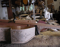 Now the gauge is used to set the neck angle. (Remember the straight edge that lined up the centerlines? It's still there, hidden behind the gauge.) Get everything in line, more or less, finish gluing the back on, and you've got a neck set in line with the body, and at the right angle. It's pretty rigid in the side to side plane, but can still be move up and down pretty dramatically. When the top is glued the neck angle and projection are finalized, almost. Slight adjustments can still be made when the fingerboard is fitted. Viols! Viols! |